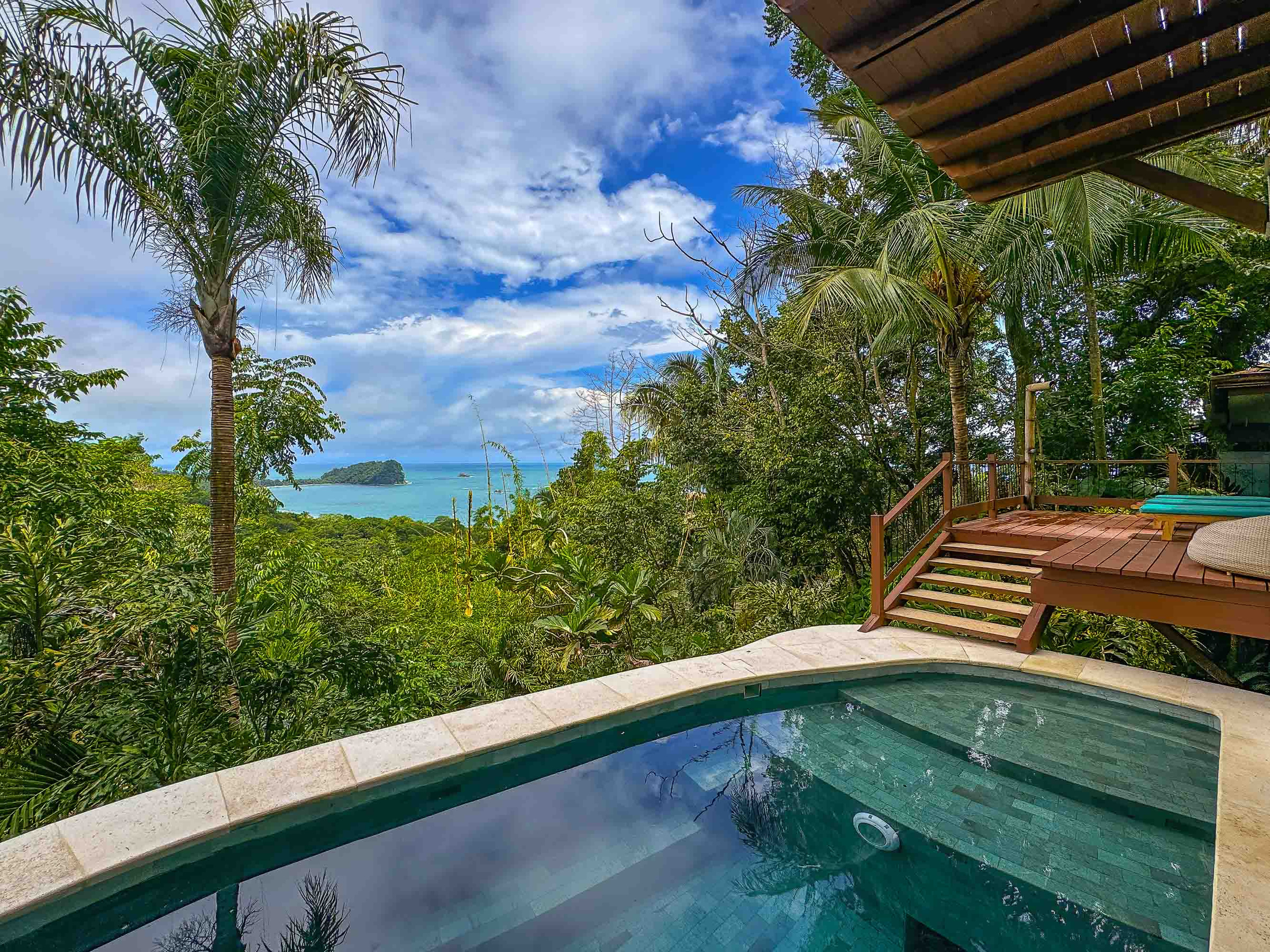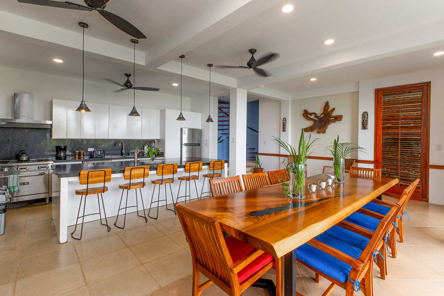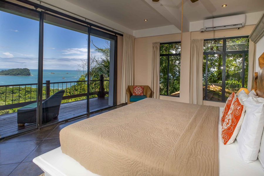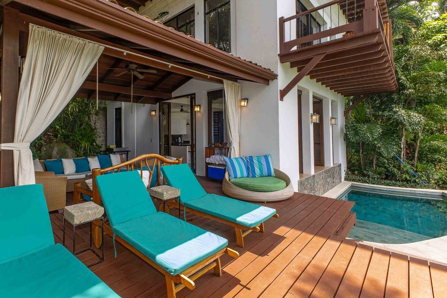 The entrance level of the home welcomes visitors to a beautiful and fully renovated kitchen and dining area which looks out over the pool and out to the National Park. This air-conditioned space connects seamlessly to a beautiful outdoor deck space which has both covered and exposed areas from which to marvel at the views and the daily visits from the wildlife. There are two bedrooms accessed off this covered terrace area, including the lower level suite with two full beds. The canopy suite located just off the terrace area has a king size bed and a unique suite feel in the jungle canopy. The master bedroom is one level up and is an incredible oasis with a king size bed, and beautifully appointed bathroom complete with private jacuzzi tub and custom sinks of glazed earthenware.