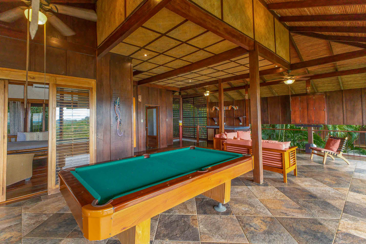 The next level of the home hosts an open air living and gaming area which is one of the most unique features of the home. This common space is literally suspended at canopy level and provides the most amazing views, breezes, and opportunity to share time with family and friends in the most authentic of Costa Rican settings. There is an additional bedroom and bathroom on this level as well, and the top floor is a favorite with rental guests which is the "nest suite". This cozy bedroom and bathroom are at the apex of the home and are a great spot for kids and teens!